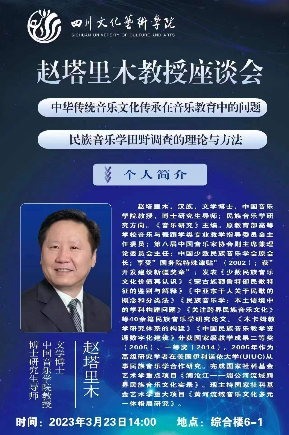 为进一步提升我院教师、学生对中华传统音乐文化的深刻理解及如何将中华传统音乐文化与音乐理论课程相勾联在课程中进一步有效地实施与开展,特邀请学校名誉校长,中国音乐学院教授、博士生导师赵塔里木教授于2023年3月23日,在综合楼6-1召开座谈会,会议由音乐舞蹈学院党总支书记肖友明教授主持。