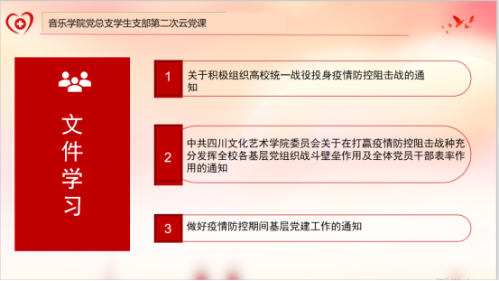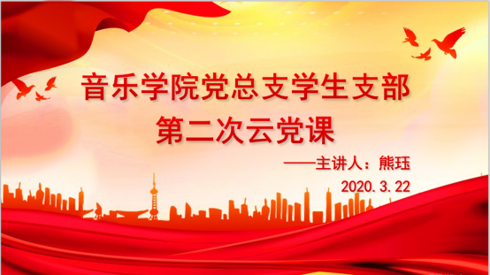 2020年3月23日下午,音乐学院党总支学生支部召开主题为“守初心,担使命,抗疫情,做先锋”的云端主题党日活动。本次会议由党支部书记熊珏主持,学生支部全体党员和预备党员在线参加。