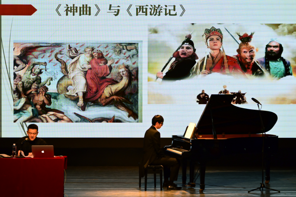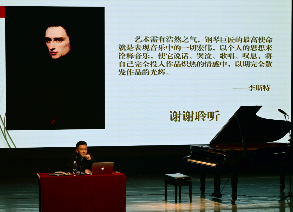 此次讲座式音乐会由音乐舞蹈学院常务副院长唐进教授主讲,以历史人文为脉络,结合作品解构、演奏示范、拓展知识捕获等方面,为大家深度解析了“钢琴之王”李斯特音乐风格基因的组成以及表现特征。讲座上,唐进教授指导的三名学生,2020级音乐教育专业张无非、2020级音乐表演专业林毅隆、2021级音乐表演专业张景睿三位同学,为大家演奏了李斯特的《超技音乐会练习曲“回忆”》《西班牙狂想曲》《“但丁”幻想奏鸣曲》等作品,现场掌声不断。