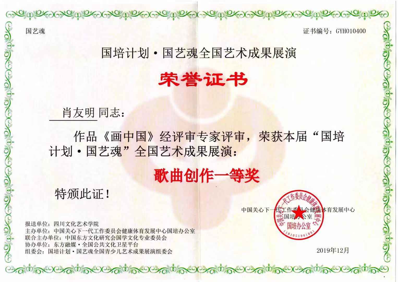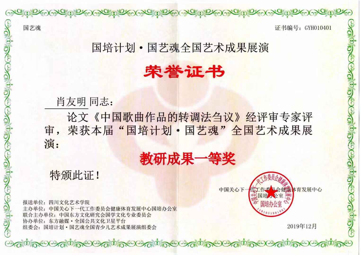 由我校报送的音乐学院党总支书记、国家二级作曲肖友明副教授创作的作品《画中国》经评审专家评审,获歌曲创作类一等奖,论文《中国歌曲作品的转调法刍议》获教研成果类一等奖;音乐学院教师苟利芝撰写的论文《四川清音融入高校声乐教学研究》经评审专家评审,获教研成果类一等奖。